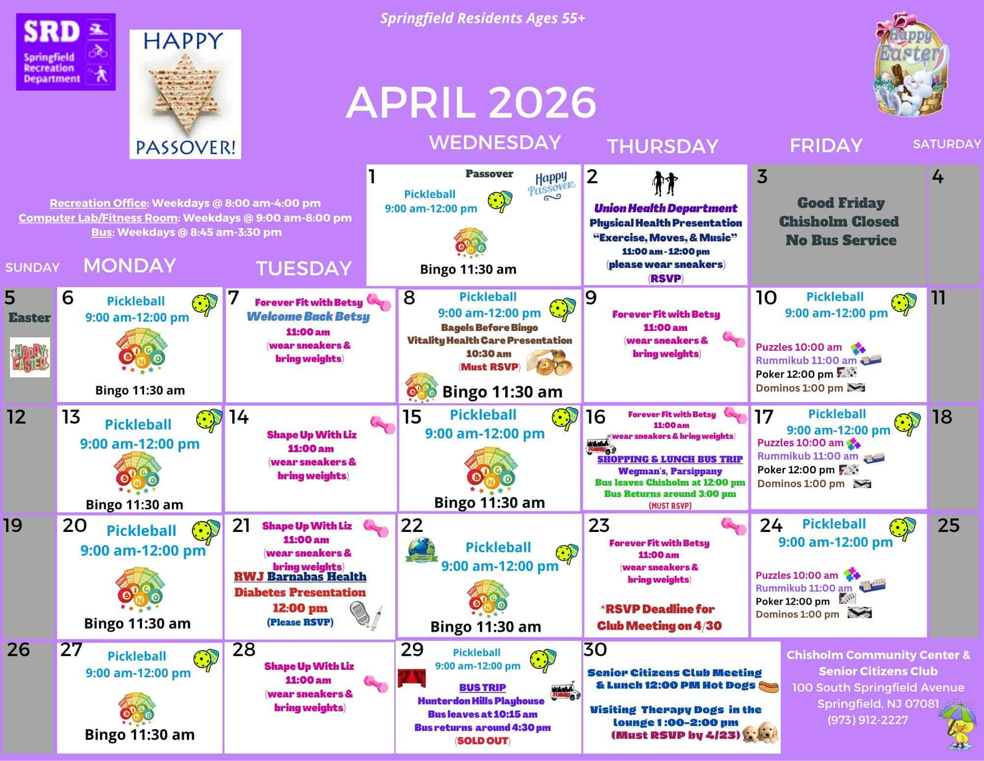 The Springfield Recreation Department’s April 2026 calendar for the 55+ community includes: a variety of games such as poker, dominos, rummikub, and puzzles; computer lab; indoor open-play pickleball (free annual registration required); “Shape Up with Liz” and “Forever Fit with Betsy” exercise classes (free annual registration required); fitness room open on weekdays from 9:00 am-8:00 pm (free annual registration required); Union Health Department “Exercise, Moves, & Music” (RSVP); RWJ Barnabas Health Diabetes presentation (RSVP); Vitality Health Care presentation with bagels (RSVP); shopping and lunch bus trip to Wegman’s in Parsippany (RSVP); bus trip to Hunterdon Hills Playhouse (sold out); and the Springfield Senior Citizens Club meeting (RSVP by Thursday, April 23).