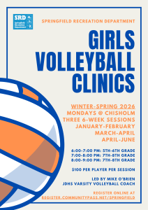 The Springfield Recreation Department is excited to announce three 6-week sessions of volleyball clinics for 5th-8th grade girls in 2026! See below for details and registration information.