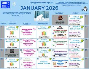 The Springfield Recreation Department’s January 2026 calendar for the 55+ community includes: a variety of games such as poker, dominos, rummikub, and puzzles; computer lab; indoor open-play pickleball (free annual registration required); “Shape Up with Liz” exercise classes (free annual registration required); fitness room open on weekdays from 9:00 am-8:00 pm (free annual registration required); bus trip to Ross Dress For Less, Five Guys, and Leafy Basket (RSVP); “A Club in Motion” with Jon; “Exercise, Moves, and Music” physical health presentation by the Union Health Department; and the Springfield Senior Citizens Club meeting (RSVP by Friday, January 23).