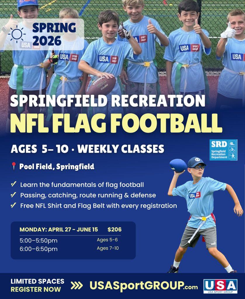 Co-ed flag football for children ages 5-10 is back this Spring! The league is administered by USA Sport Group in affiliation with NFL FLAG and in partnership with the Springfield Recreation Department. Join the fun!